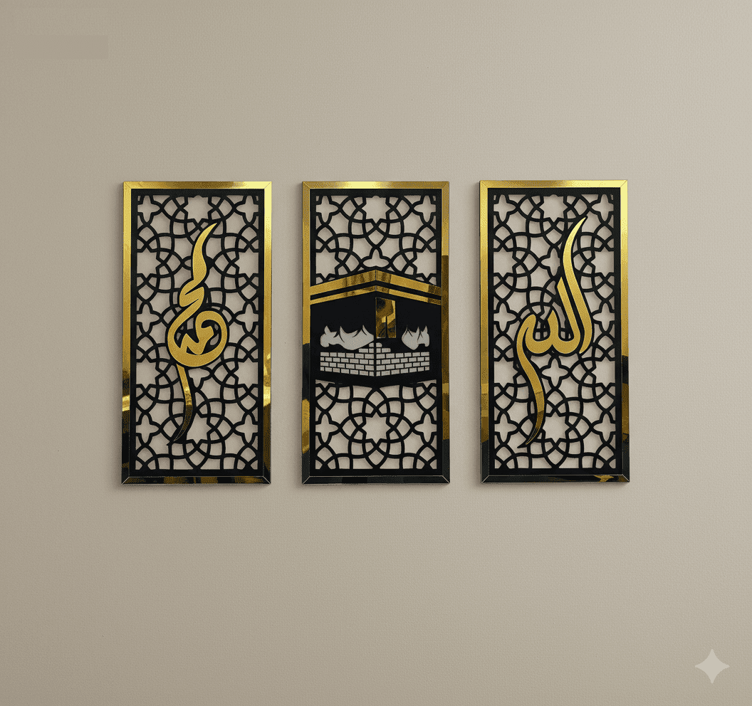 Infuse your home in Pakistan with spiritual grace and modern elegance! This stunning 3-Piece Islamic Calligraphy Wall Art Set features the sacred names of Allah, Muhammad (SAW), and the Holy Kaaba. Crafted from high-quality wood and acrylic with a luxurious gold finish, these frames are the perfect Islamic home decoration for your living room or a meaningful gift for loved ones across Pakistan.