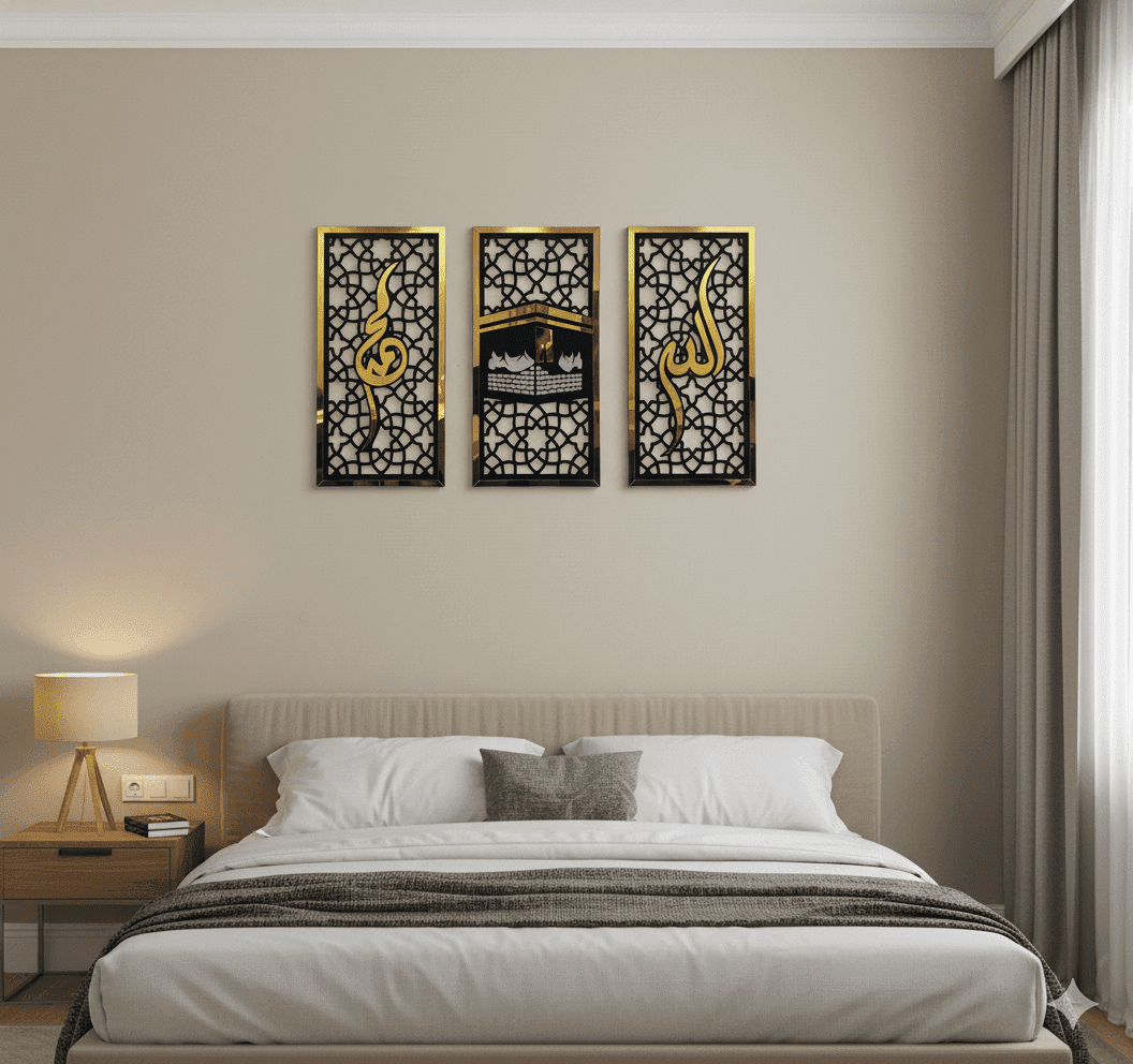 Add a touch of Barakah and sophisticated style to your living space with our 3-Piece Islamic Calligraphy Wall Art Frame Set. Specifically designed to complement the aesthetics of modern Pakistani homes, this collection serves as a beautiful daily reminder of faith. Whether you are decorating a new house or looking to refresh your prayer area, this set is the pinnacle of Islamic home decoration in Pakistan.