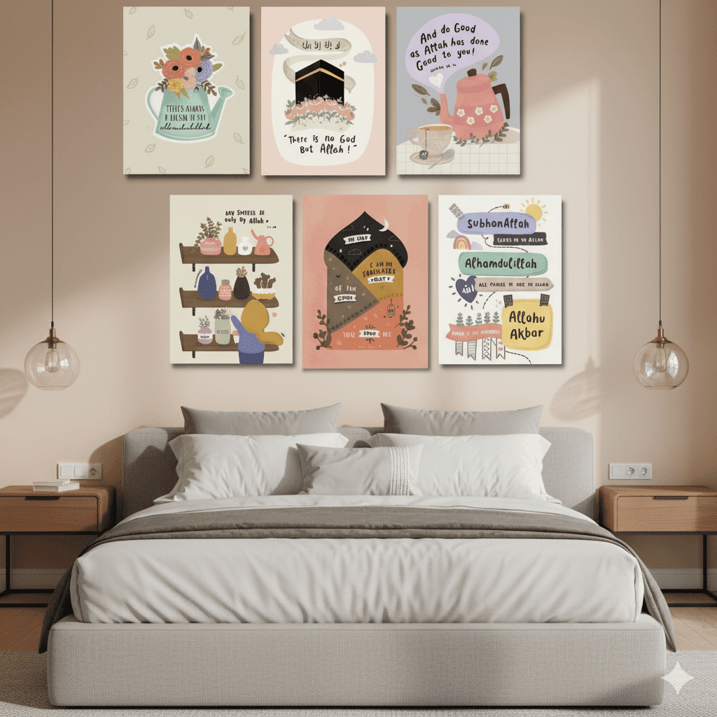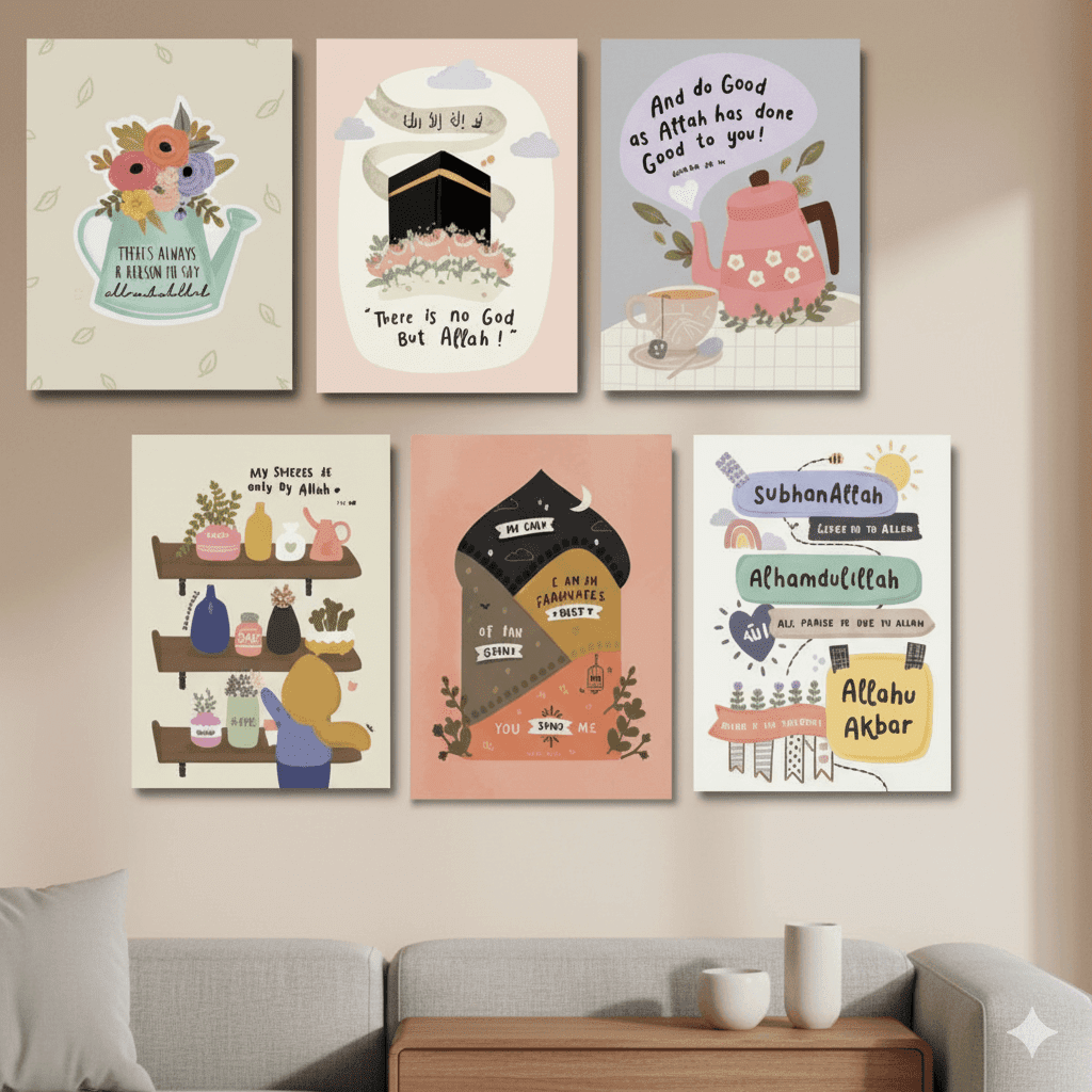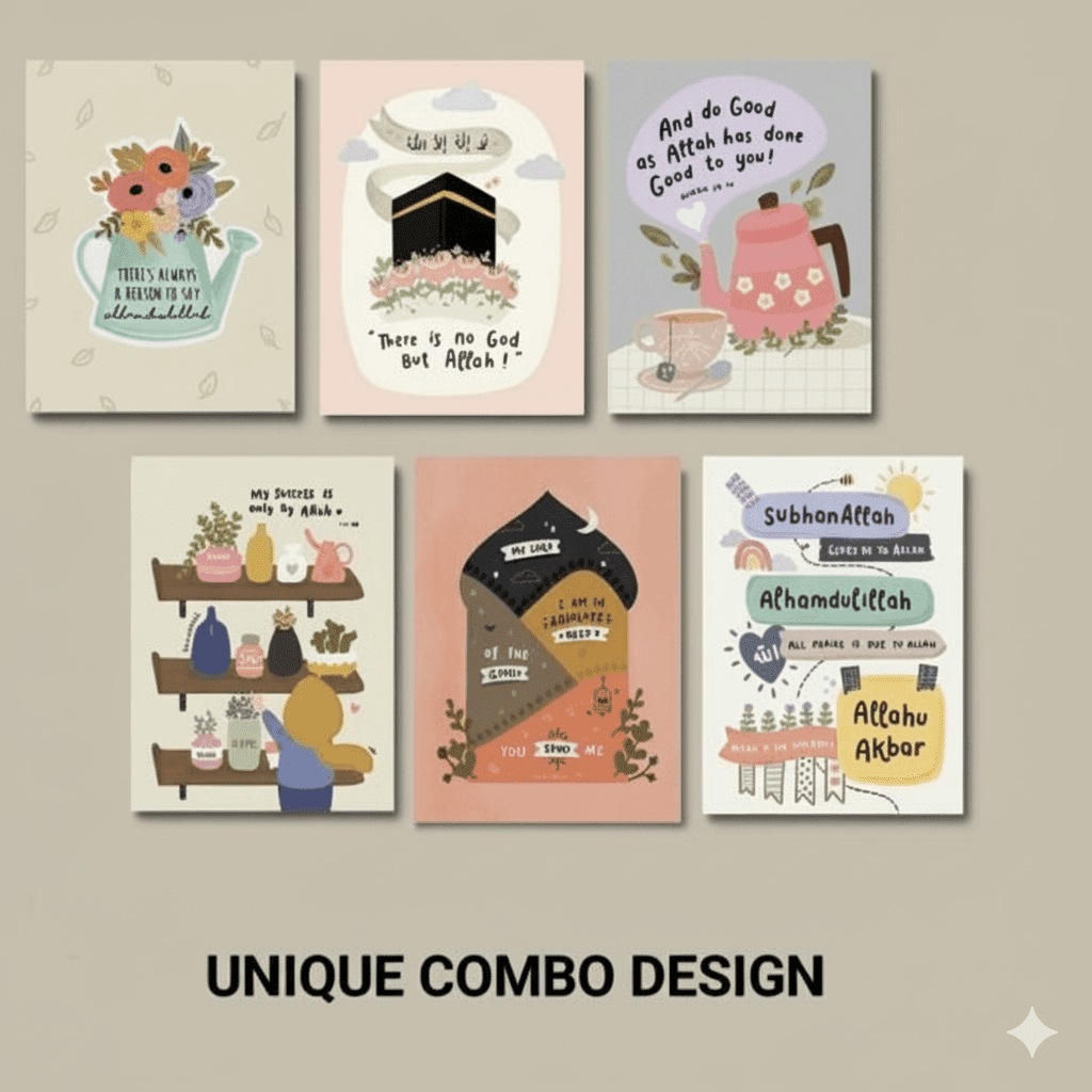 Transform your home with spiritual grace! This 6 Pcs Arabic Calligraphy Wallmate Set is the ultimate Islamic wall decoration for households across Pakistan. Each 8×11 inch piece features high-quality printing and comes with free double-sided tape for a no-drill, stickable installation. Perfect for your living room, prayer room, or as a thoughtful gift for Eid and weddings.